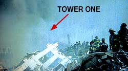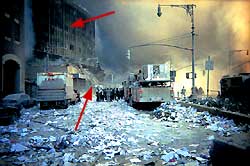 ![]() This was the scene as McCole emerged from the front windows of the World Financial Center, opposite WTC 1, immediately after the collapse of WTC 7. Note the flames burning under the steel |