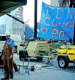 ![]() September 11, 2001. Coming down West Street, en route to the WTC. This shot was taken immediately after WTC 2 collapsed. |