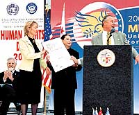 Emphasizing the importance of human rights not just on Human Rights Day, but every day, were Rabbi Allen I. Freehling of the LA City Human Relations Commission (seated); Leisa Goodman, Human Rights Director of the Church of Scientology International; Norma Foster, President of the United Nations Association USA (UNA-USA) Los Angeles-Pacific Chapter; and LA City Council member Tom LeBonge, who gave the “Multathletes” their start.