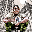 Wearing military pants and a black NBA T-shirt, the muscular middle-aged man is sleeping on the sidewalk under a freeway bridge in the bustling Westwood neighborhood of Los Angeles. It’s the morning after Fourth of July and he looks tired.