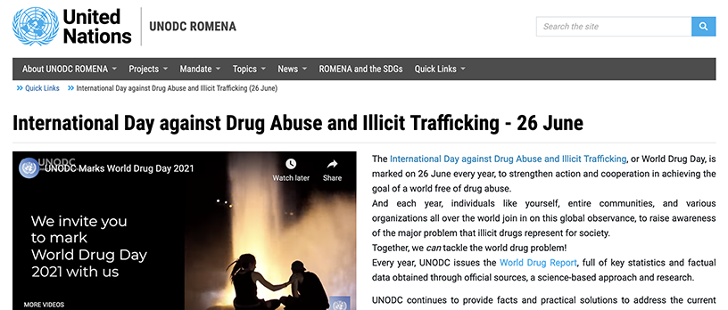United Nations International Day against Drug Abuse and Illicit Trafficking, held every June 26, promotes substance abuse education. Also called World Drug Day, its aim is to raise awareness of the global drug abuse problem and to promote the sharing of factual information about drugs and drug abuse.